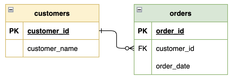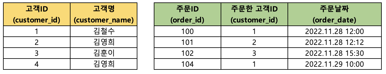 저희에게 고객정보를 담고 있는 customer Table과 주문 정보를 담고 있는 order Table이 있다고 가정해 보겠습니다.