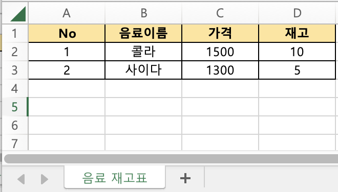 엑셀의 '음료 재고표'와 동일한 데이터를 추가해 봅니다. 데이터를 추가할 때는 INSERT문을 사용합니다.