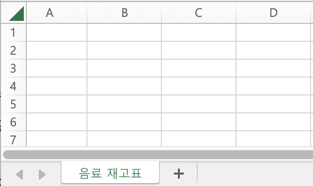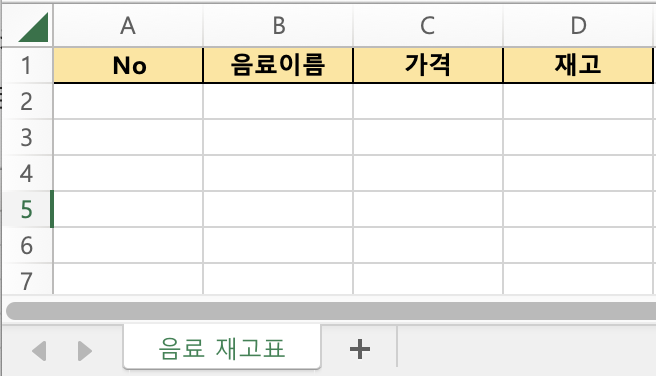 우선, 엑셀을 켜고 첫번째 Sheet에 표를 그려야 겠습니다. 표(여기선 시트) 이름은 요구사항 따라 '음료 재고표'로 지어볼게요
