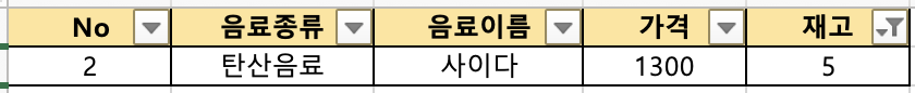 엑셀 예시와 동일하게 아래와 같은 Table 이 있다고 가정하고 WHERE절에 명시해 SELECT문으로 조회해볼게요