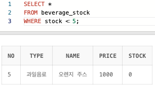 3. 재고가 5개보다 작음 / 작거나 같음