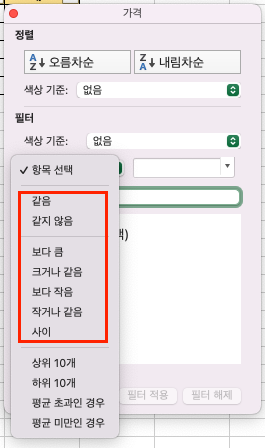 숫자의 경우 같음, 크거나 같음, 작음, 크거나 작음 등 다양한 옵션을 제공하고 있죠.