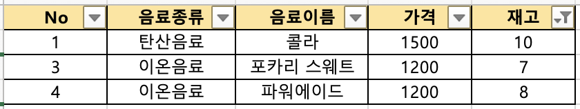 실습된 결과를 비교해보면 필터기능을 사용한 엑셀 결과와 SQL 실행 결과가 같다는 것을 보실 수 있는데요!