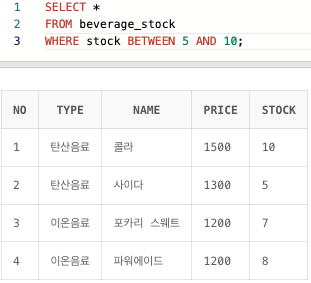 WHERE stock BETWEEN 5 AND 10; -- 5이상 10이하