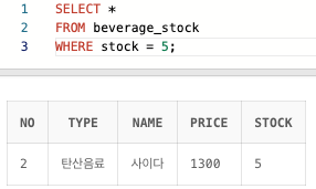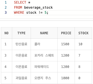 WHERE stock != 5; -- != 대신, ^=, <>도 사용 가능
