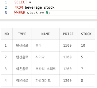 참고로, WHERE 절에서는 보통 '비교할 column 명'을 연산자 앞에 '비교할 값'을 연산자 뒤에 표현합니다.