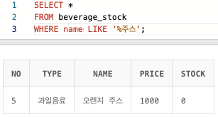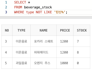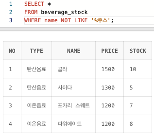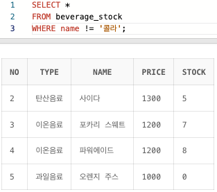 WHERE name != '콜라'; -- != 대신, ^=, <>도 사용 가능