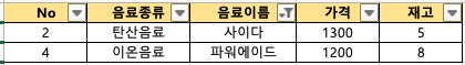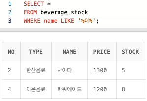 4. 음료이름에 '이'라는 문자가 포함 / '이'라는 문자가 포함되지 않음