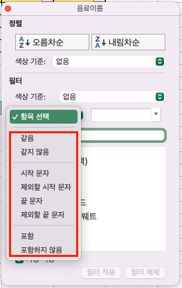 엑셀 필터 기능을 텍스트 영역에서 사용하면 아래와 같은 조건들이 나옵니다.