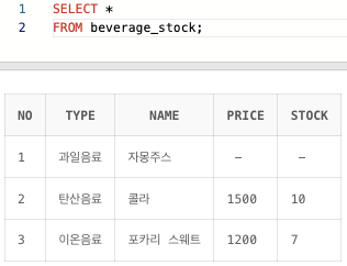 (아래는 Oracle Live SQL에서 PRICE와 STOCK이 NULL인 데이터를 조회한 결과)