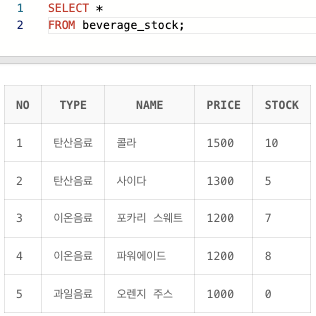 조금 번거롭지만 이전 사용했던 엑셀 표에서 '음료종류'와 '가격' 항목만 분리시켜봅니다.