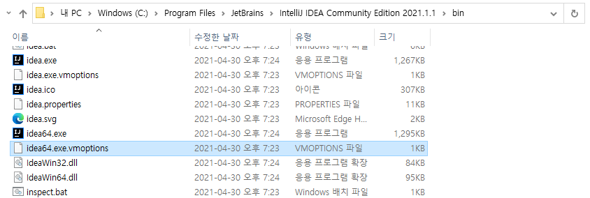 - PC 내 Intellij 설치 경로에서 bin 폴더로 이동