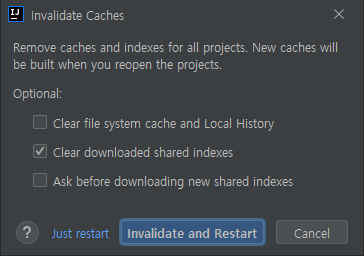 (그냥 Intellij 종료 후 재시작을 해도 문제가 그대로여서 아래 방법 사용)