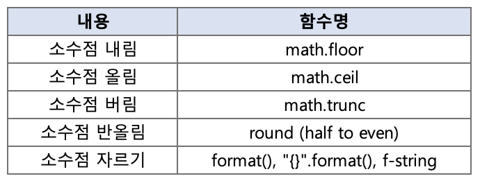 소수를 내림, 올림, 버림에 사용되는 함수는 아래와 같습니다.